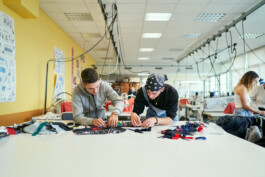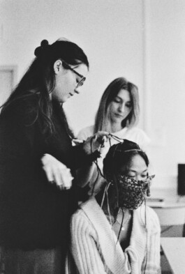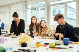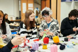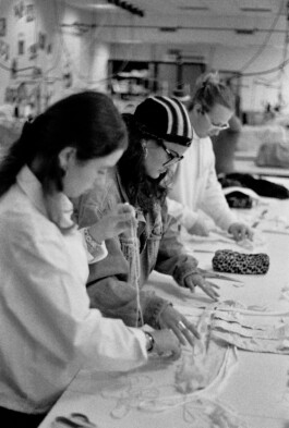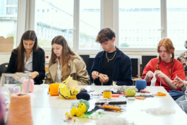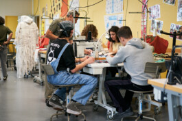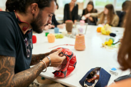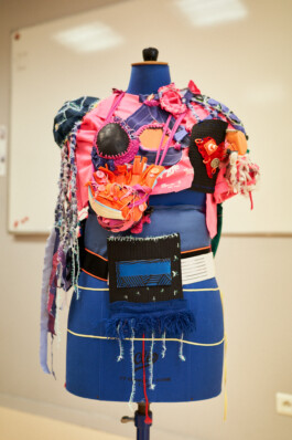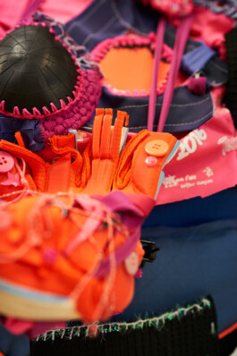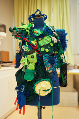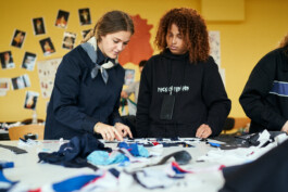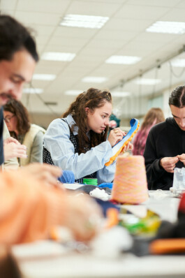Les étudiants ont également participé à des ateliers de surcyclage animés par 6 designers textiles : Mona Luison @monaluison (réalisation de petites sculptures de la taille d’une main, assemblées en 3 parures monochromes), Sabine Feliciano @sabinefeliciano et Gisèle Jacquemet @giselejacquemet (réalisation de petits objets assemblés en une parure grâce à la technique du crochet à la main), Mara Tchouhadjian @maratchou, (création de masques upcyclés) Catherine Seixo et Hervé Poeydomenge @hervepoeydomeng (réalisation de deux sweat à capuche réinventés, en utilisant des techniques de laçage et de tressage).